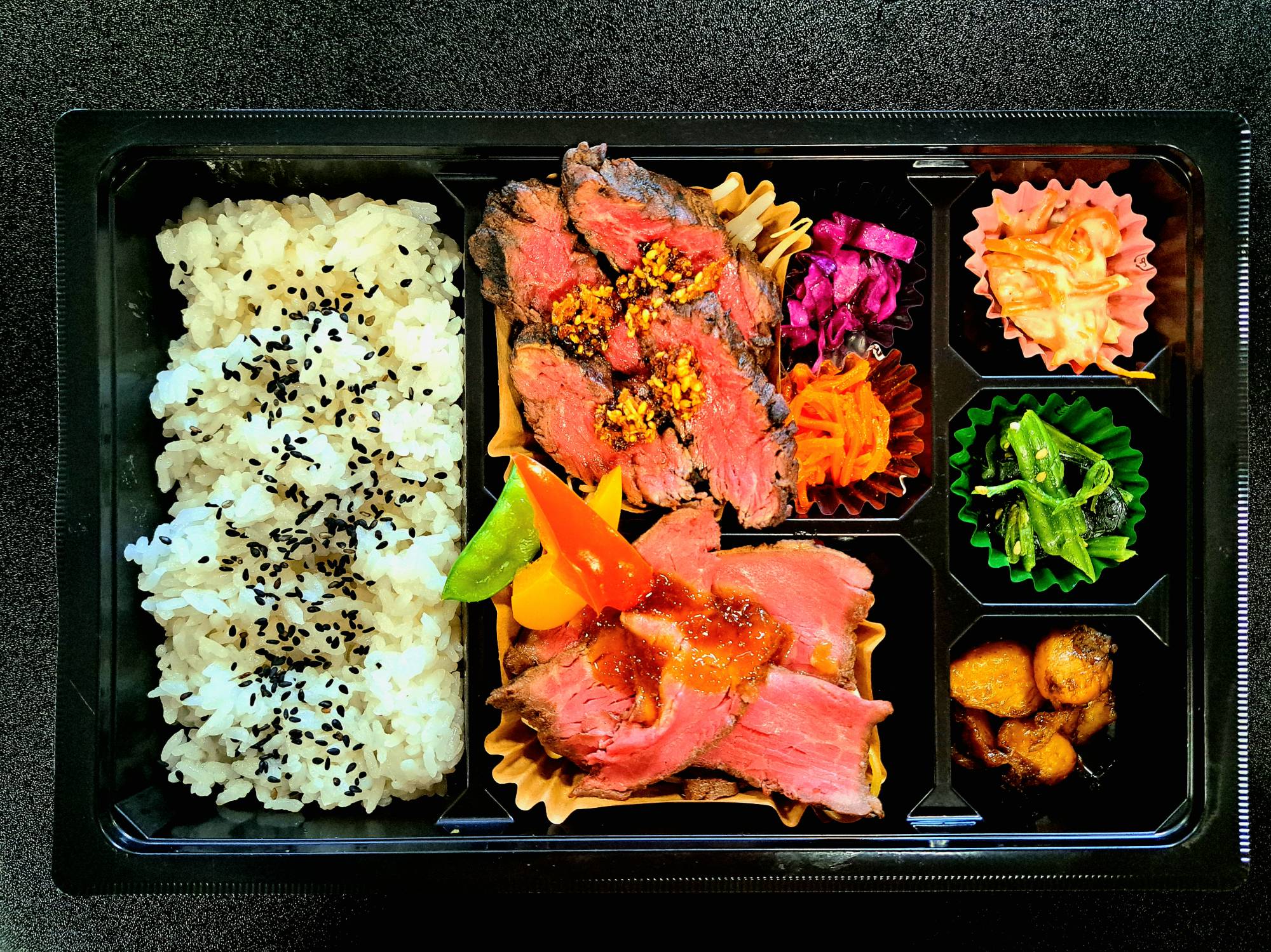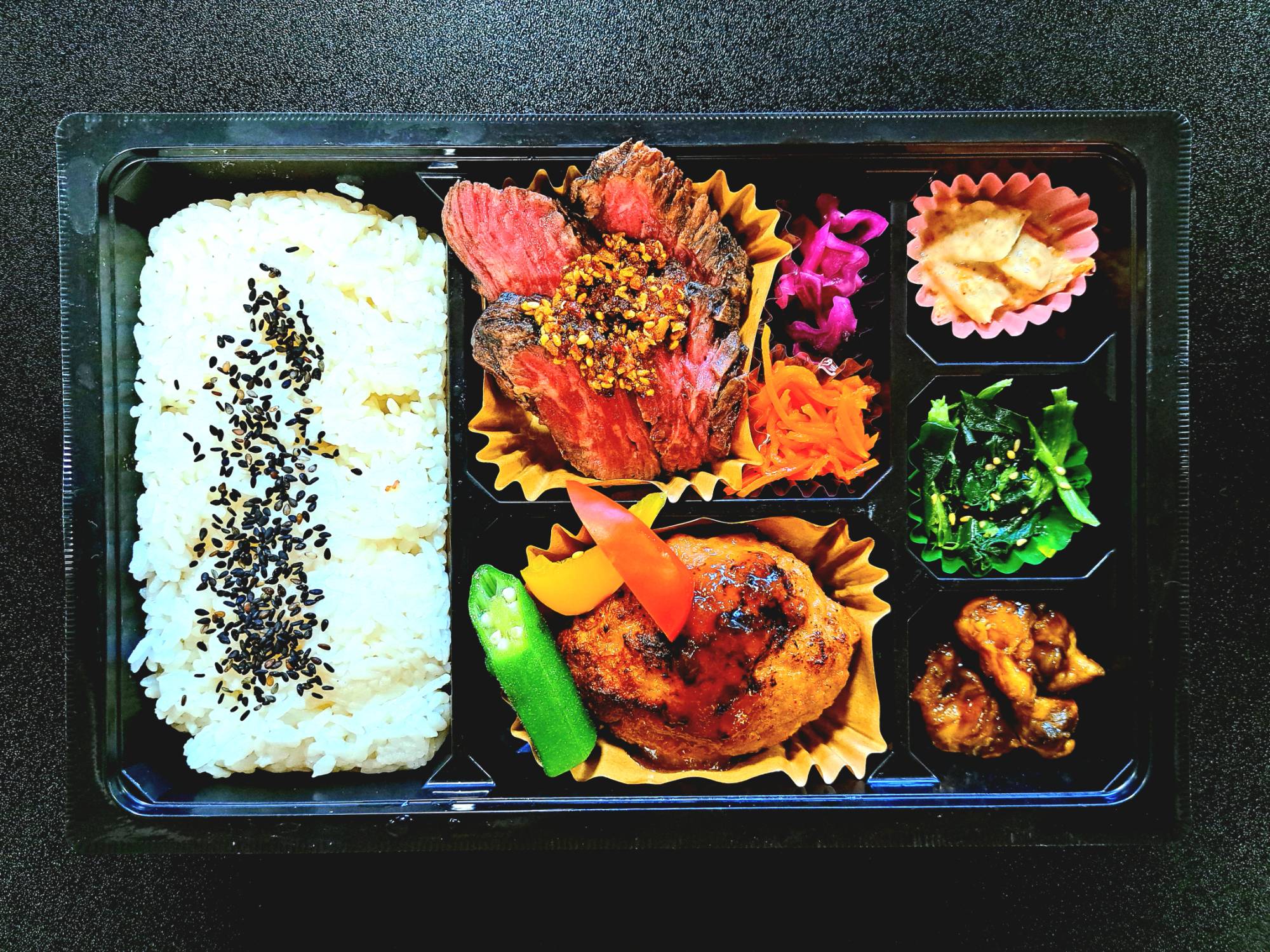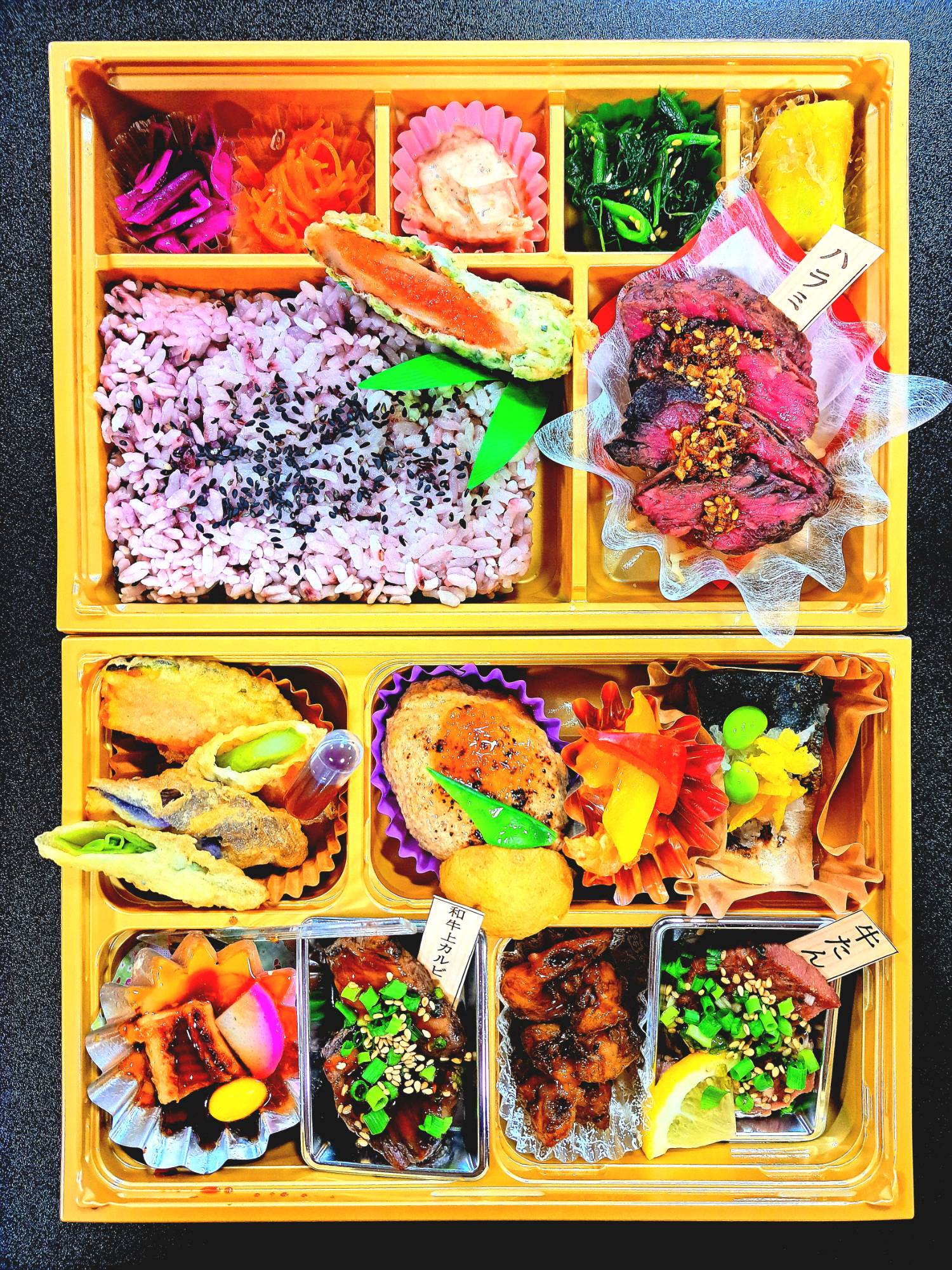 人気ハラミと、赤身で柔らかく食べやすい和牛ローストビーフのコンビ弁当
